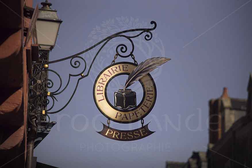 Photo vintage dans le centre-ville de Josselin mettant en avant l’enseigne en fer forgé de style médiéval de la devanture de la librairie, papeterie et presse du vieux quartier traditionnel.